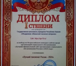 По результатам работы экспертной группы в рамках конкурса, сайт нашего учреждения награжден дипломом I степени за 1 место в номинации «Лучший пансионат России-2024».