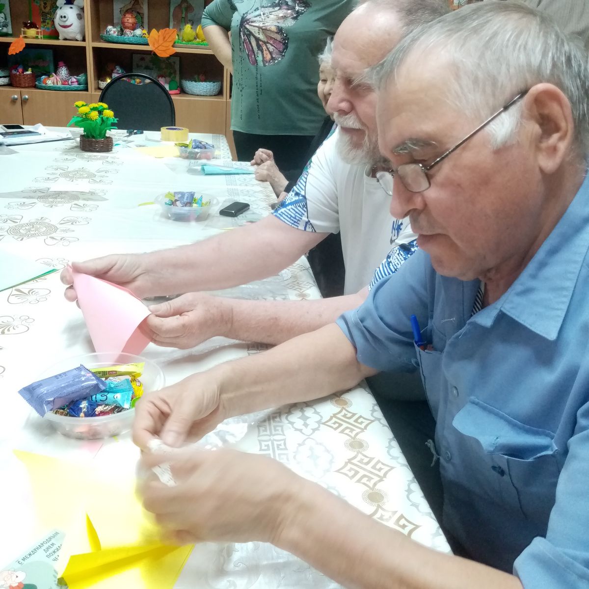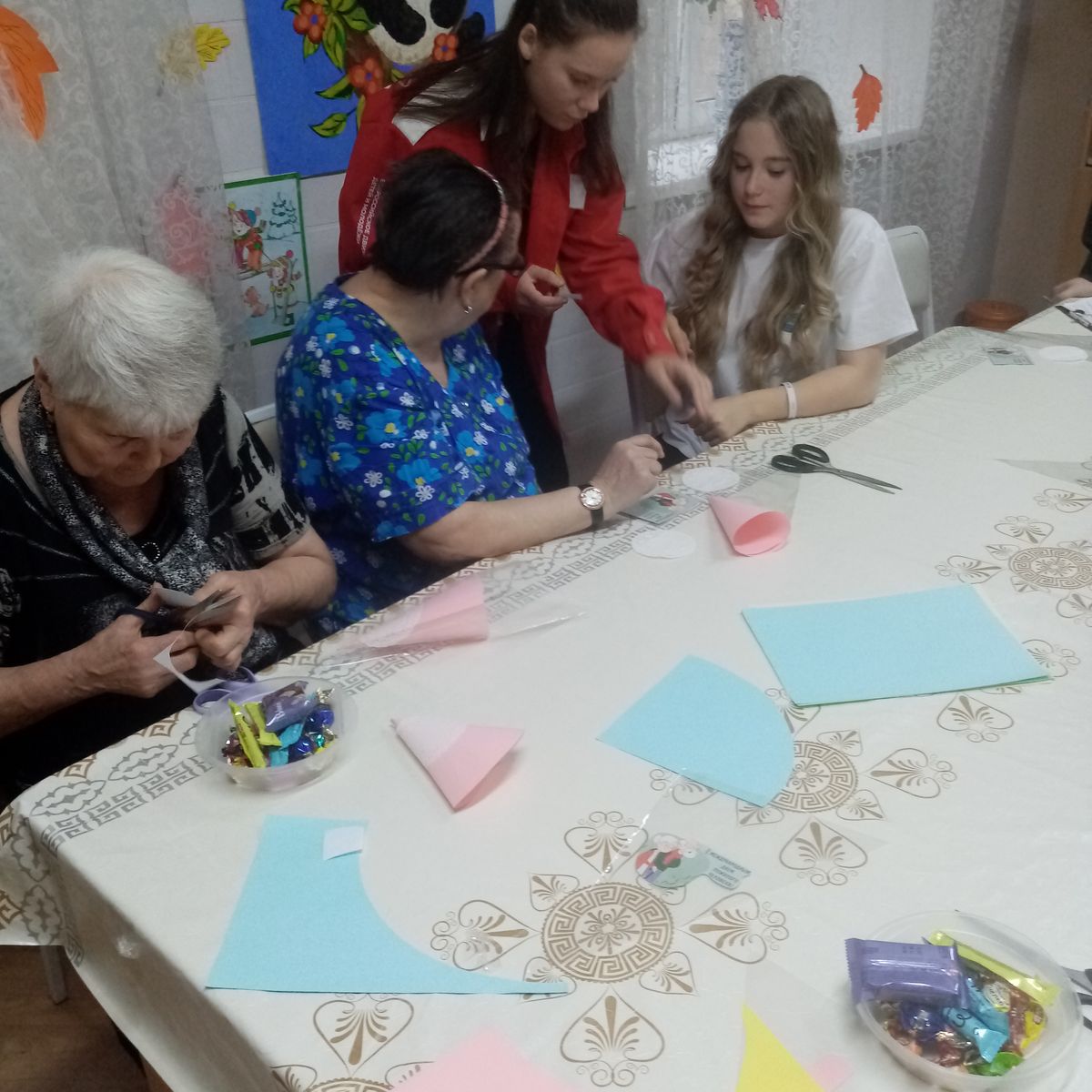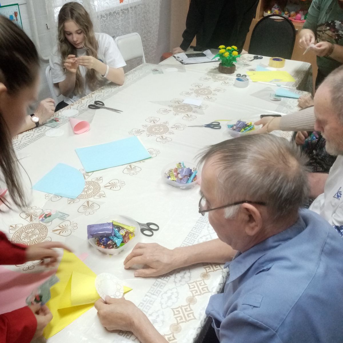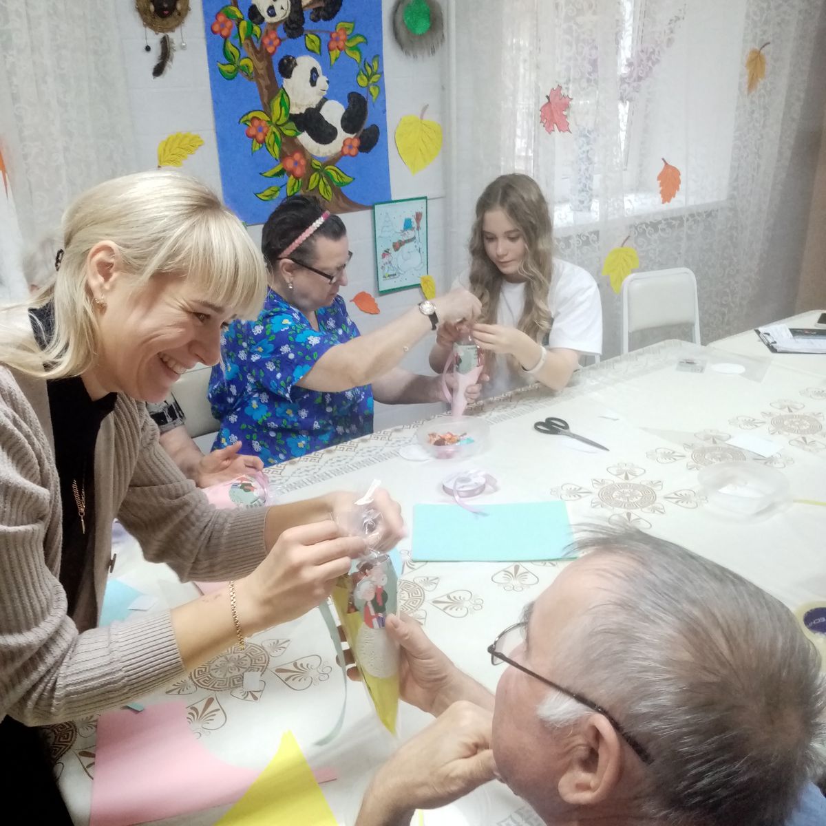 Ребята вместе с жителями принялись за работу, активно вырезали яркие фигуры для упаковки, оформляли и клеили аппликации, вели беседы, помогая друг другу в сотворении красивого пакета для подарка. В процессе изготовления ребята рассказывали различные истории о волонтерском направлении, а жители делились интересными моментами из своей жизни.